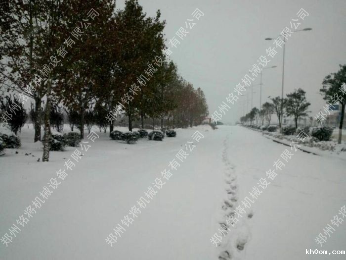 来到公司,车间厂房也盖上了一层“厚厚的白棉花被子”,连我们放在厂院里的设备都盖满了厚厚的一层雪。看保温砂浆设备都“白了头”。下了一夜,积雪非常厚,有十多公分。路都堵住了。