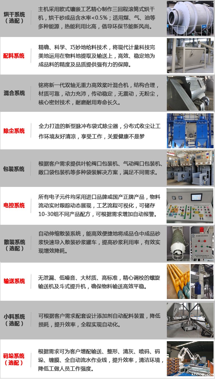 该生产线主要由原料储存系统、配料称重系统、输送系统、混合系统、气动系统、包装系统及除尘系统构成。主控制系统依据选定工艺配方下达生产指令,系统自动从储料仓中按配比提取原料,原料经配重后依次进入待混仓及无重力高效混合机,实现快速混合作业(3-5分钟)。达到混合精度要求后,成品砂浆被输送至具备二次混合功能的成品仓,进入自动灌装流程。新设计的自动包装机按要求进行定时定量灌装作业,大大提高产出效率,包装好的成品被送至成品区堆放,等待出厂。